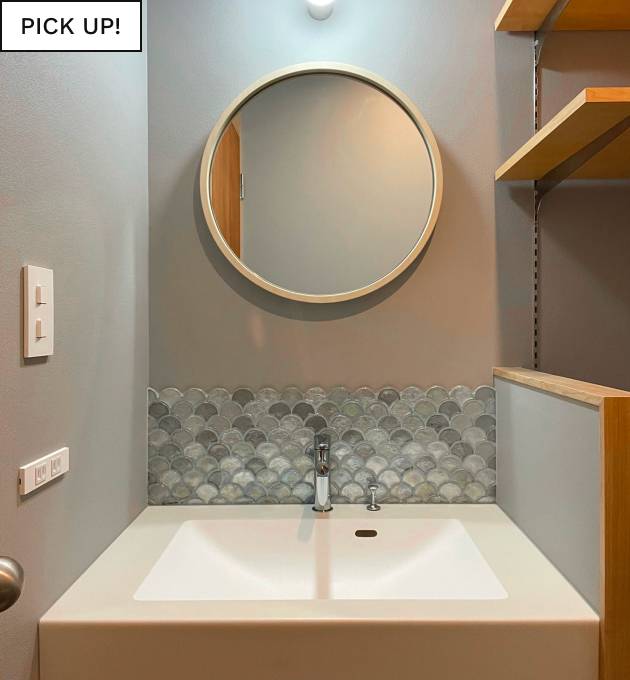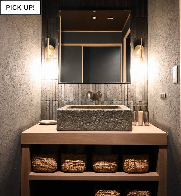 洗面台は、神社の「手水舎(ちょうずや)」をモチーフにデザインしています。質感にこだわり、洗面台はモルタルとレジンを使用した製作のもの。