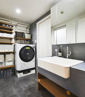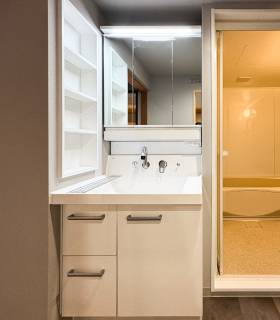 収納できるミラーや、掃除しやすいシンプルなユニット洗面。