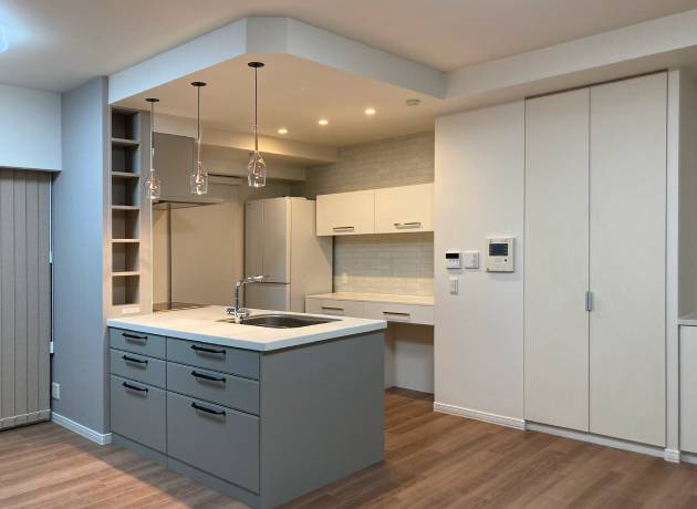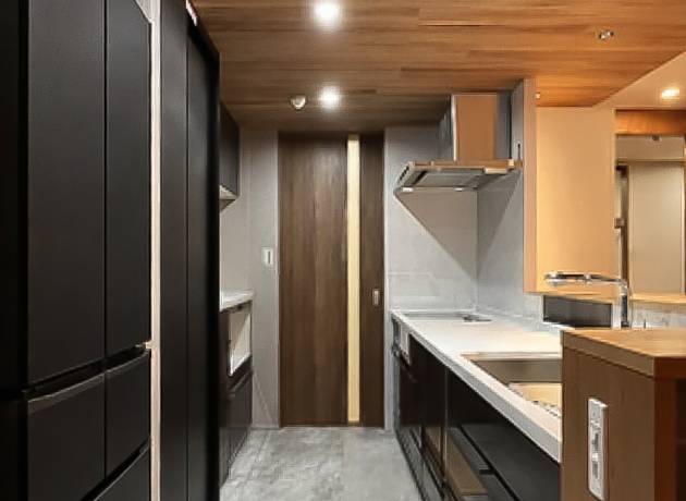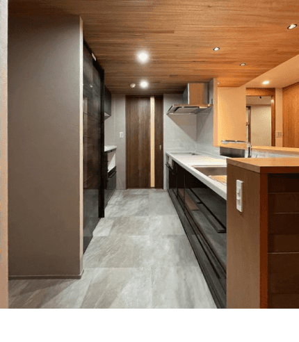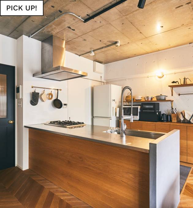 ブラスト加工を施した天板に、オーク材とモルタルをあしらい、お客さまが好まれた「木+コンクリート」の組み合わせにぴったりのキッチンを造作しました。キッチン背面のキッチンカウンターもオークの木目がそろって美しく温かみがあります。